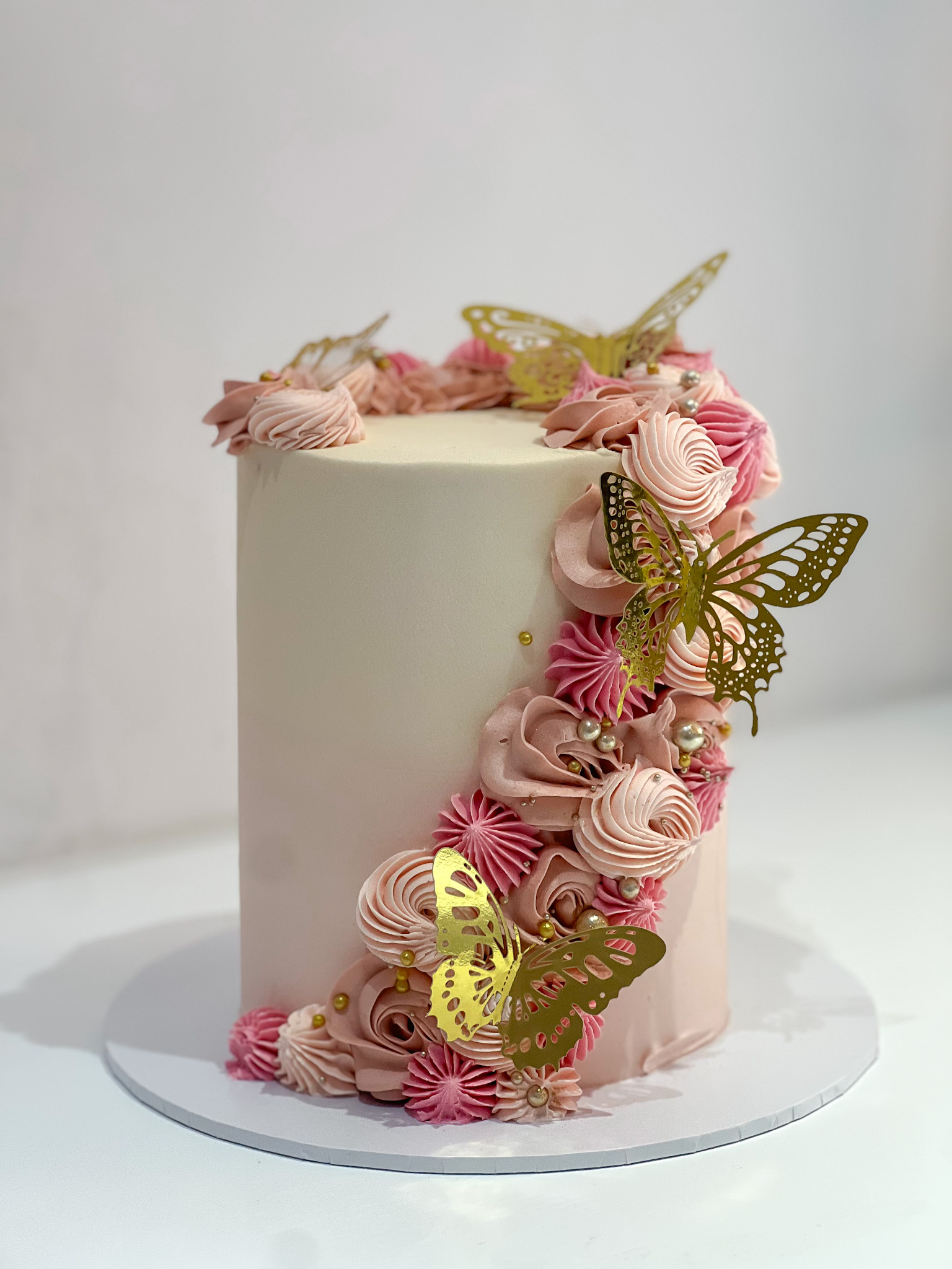 Elegant butterfly cascade celebration cake featuring smooth buttercream with hand-piped detailing and delicate butterfly accents. Perfect for birthdays, baby showers and special occasions, with a choice of colours, flavours and personalised message.
