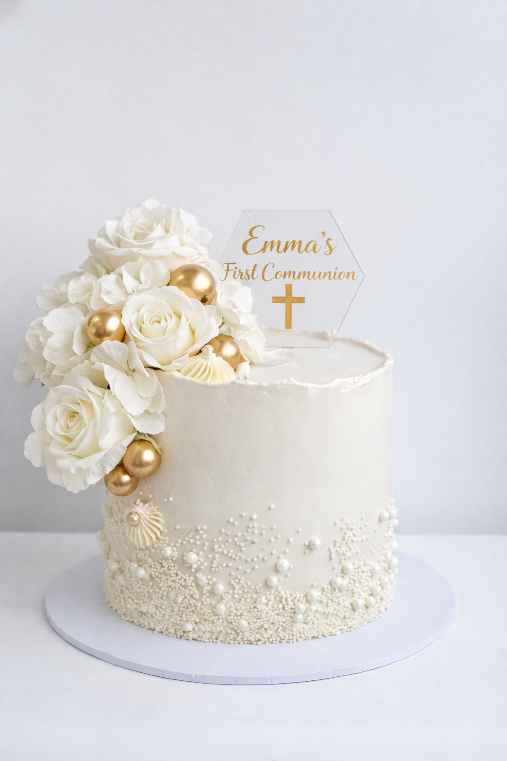 Elegant pearl and floral communion cake