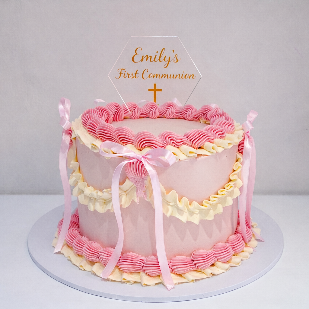 A timeless beauty with a touch of nostalgia, our Elegant Vintage Cake features intricate buttercream piping, delicate ruffle details, and satin bows topping for a sophisticated finish. This retro-inspired cake is perfect for birthdays, anniversaries, or any special celebration that calls for a vintage aesthetic with a modern twist.