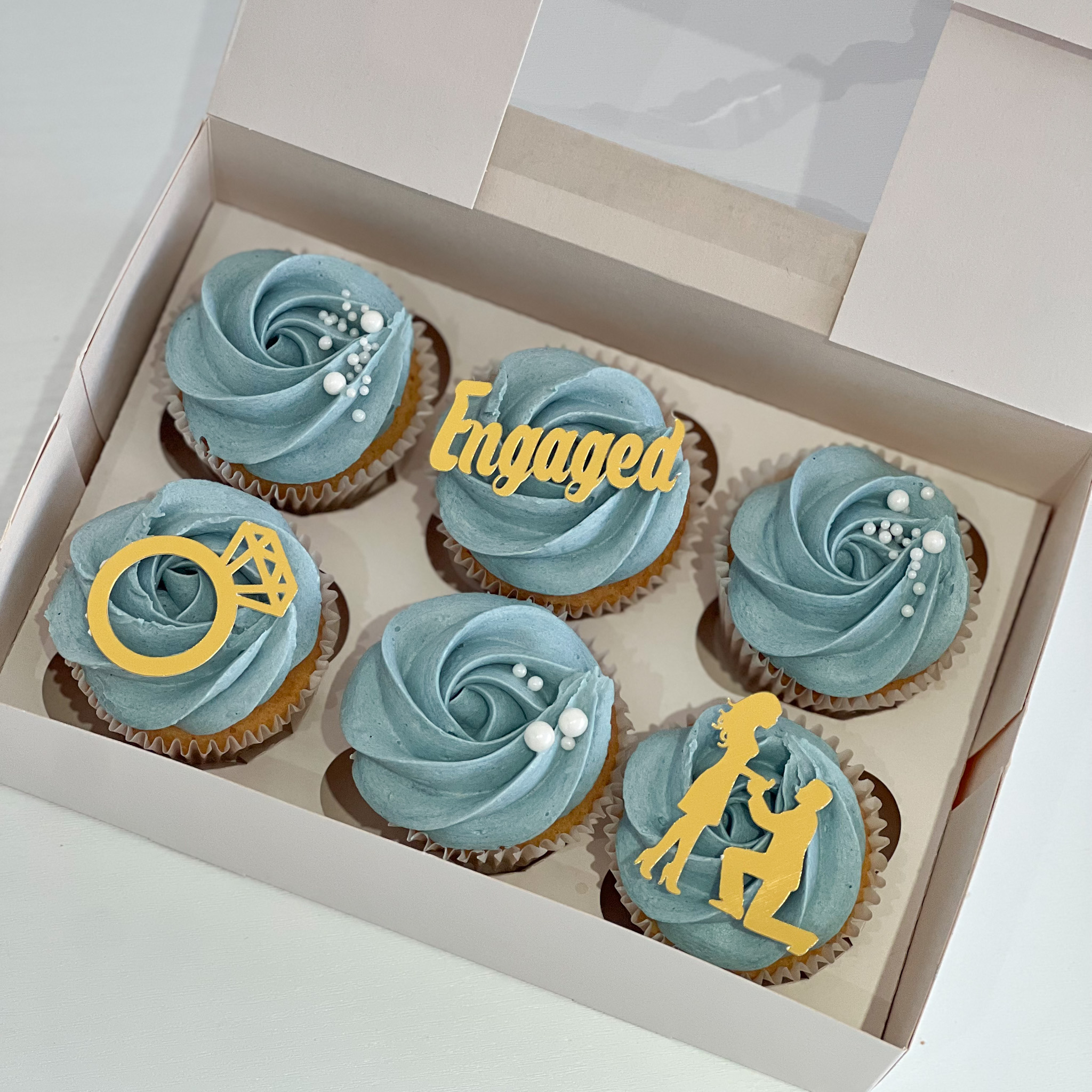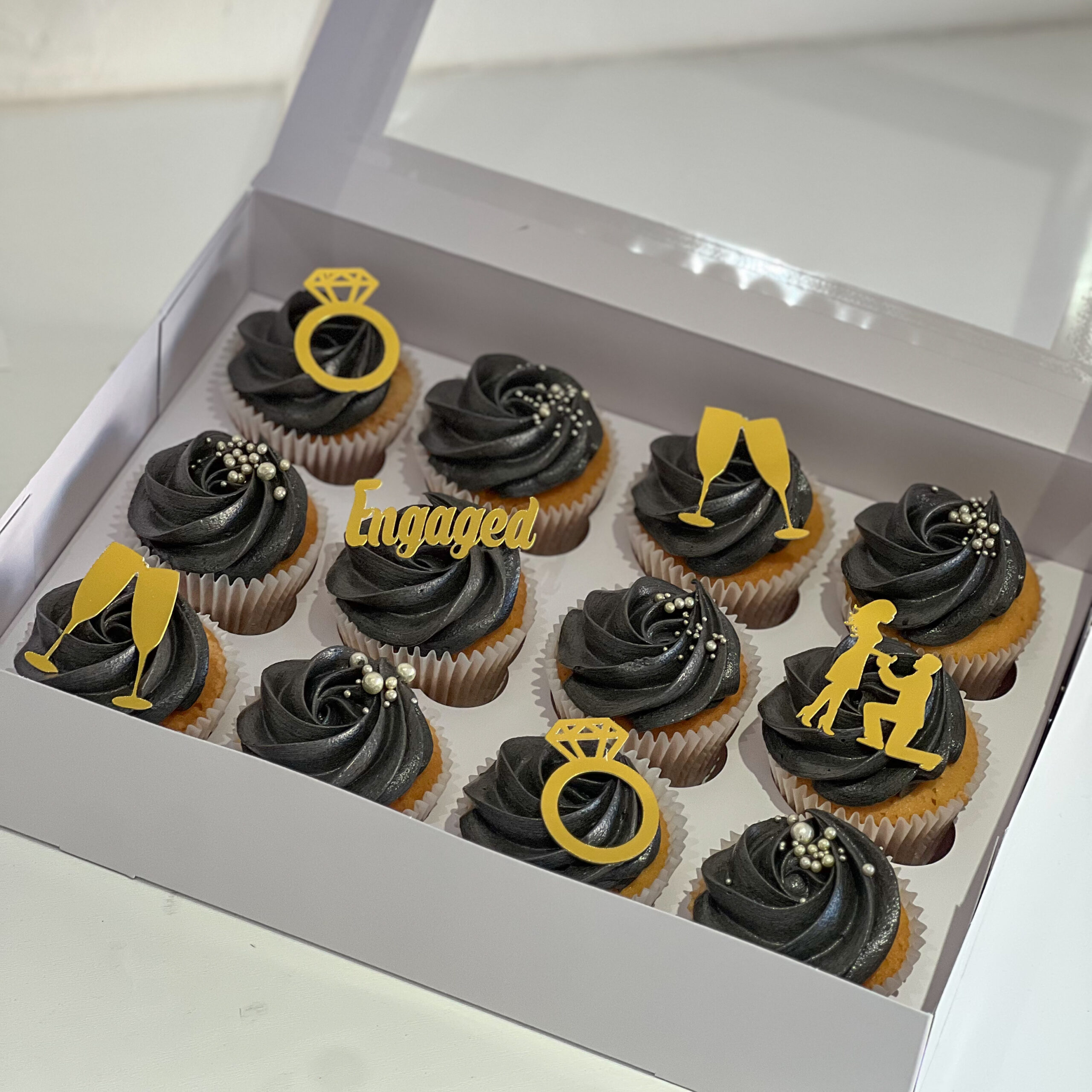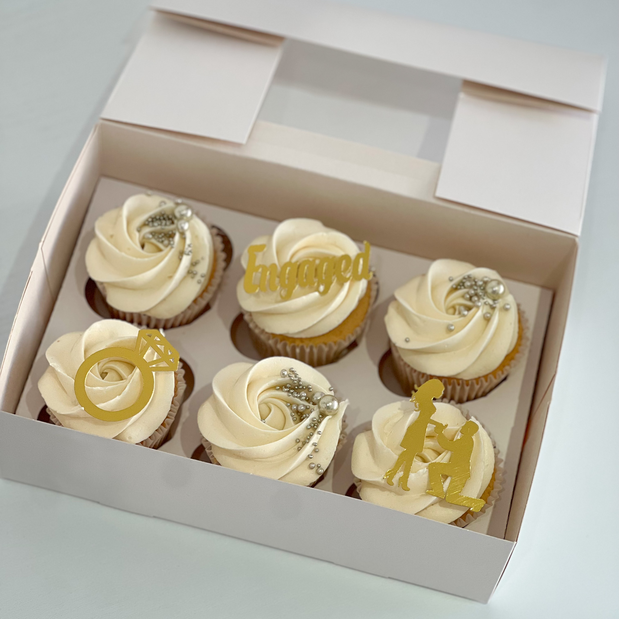 Celebrate your  engagement or gift the happy couple  with a beautiful set of  cupcakes! Decorated in elegant buttercream swirls and metallic gold card toppers.