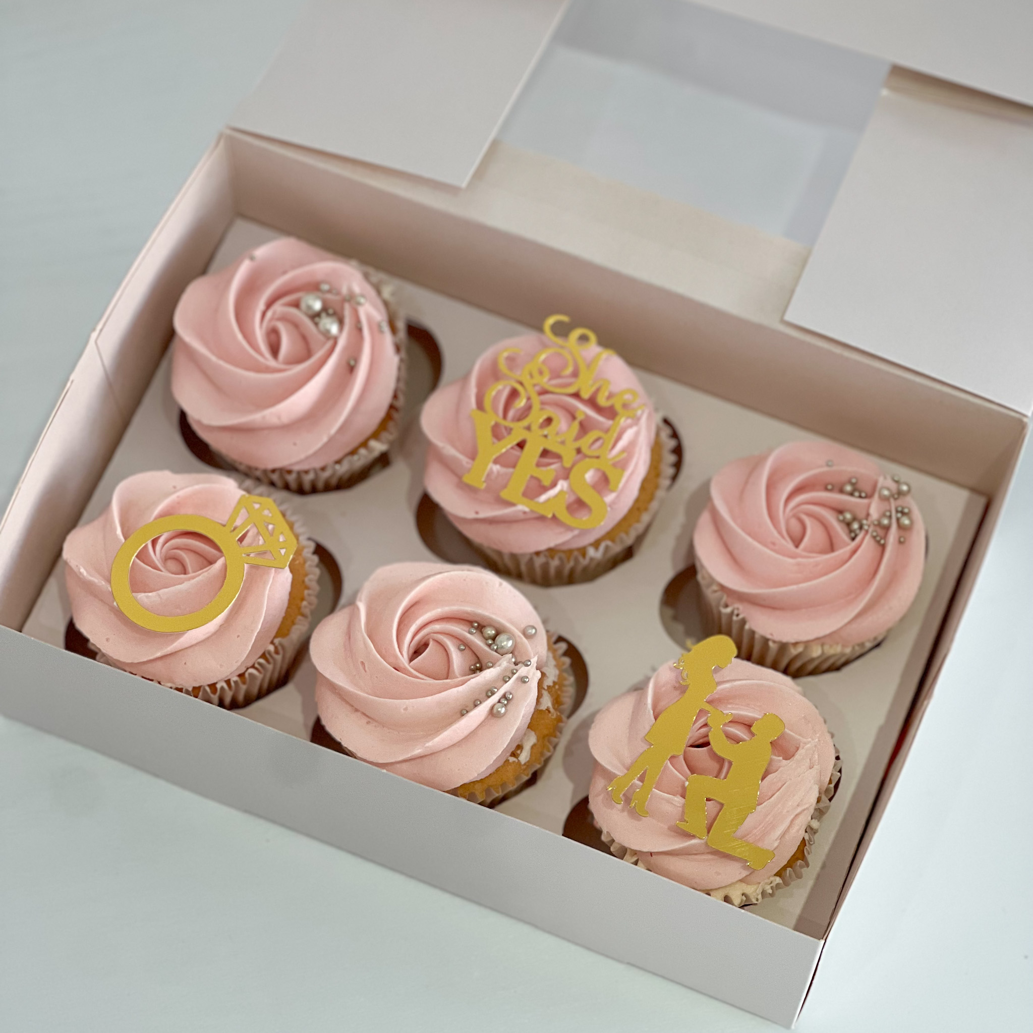 Celebrate your engagement or gift the happy couple with a beautiful set of cupcakes! Decorated in elegant buttercream swirls and metallic gold card toppers.