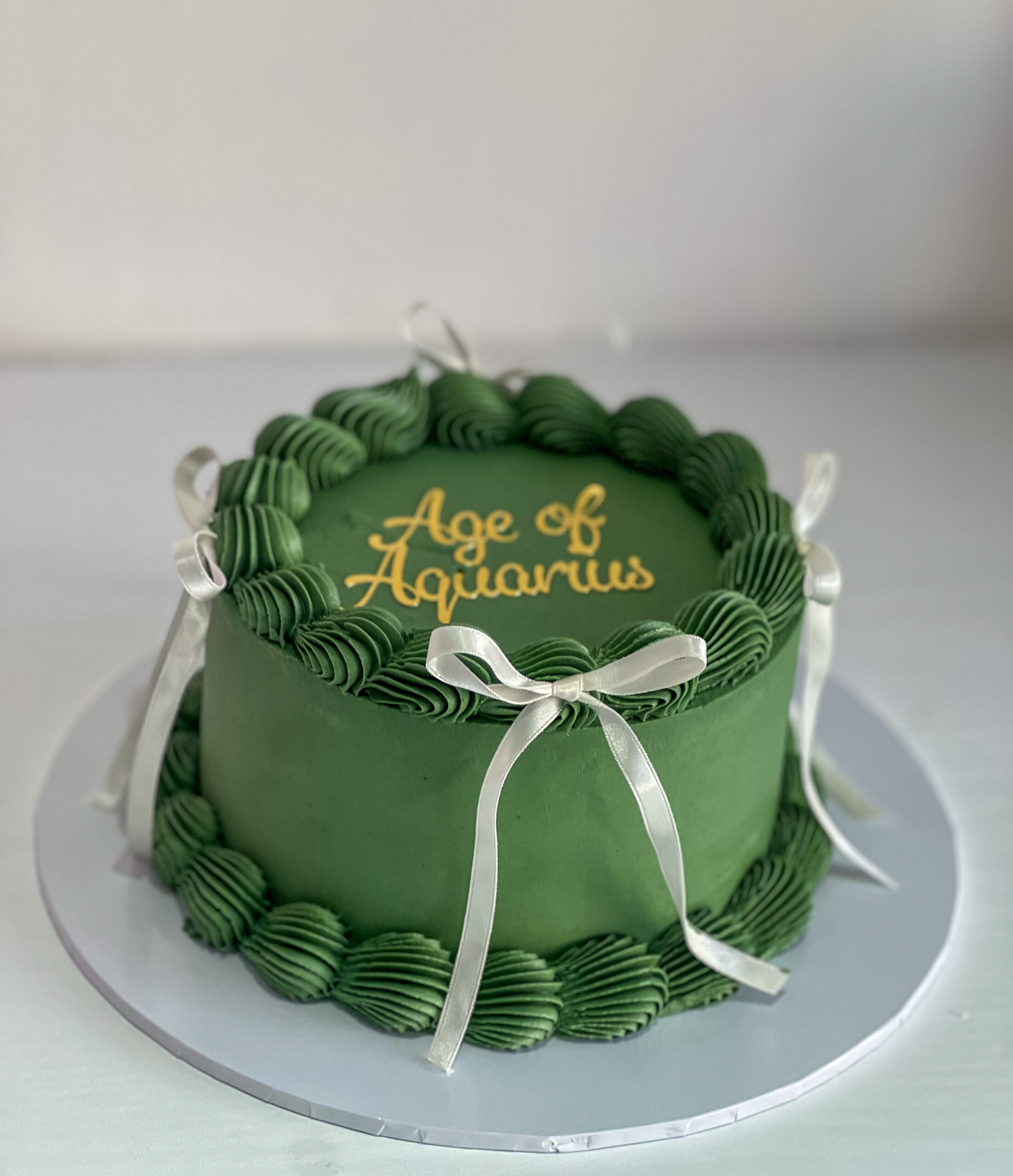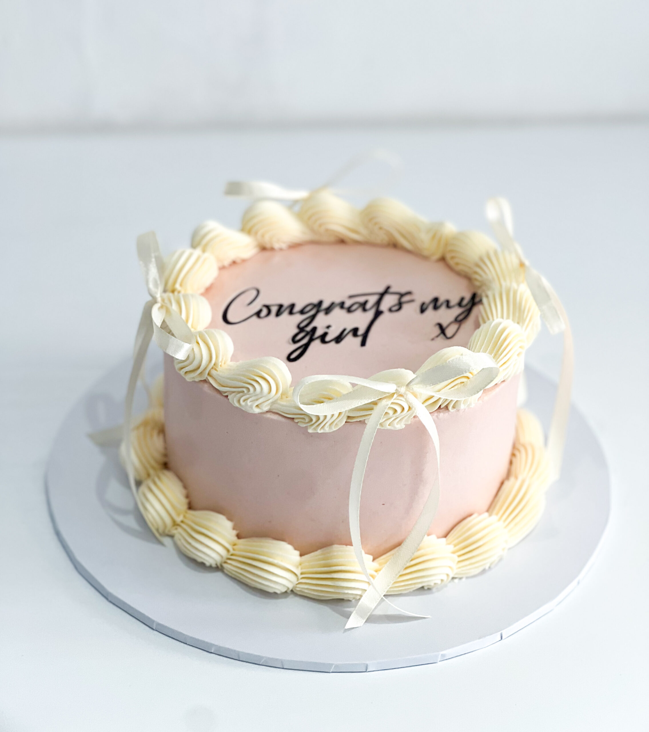 Buttercream celebration cake with vintage look from piped shells adorned with satin ribbon bows. Perfect for special occasions to casual celebration in Lanarkshire and the wider Glasgow area.