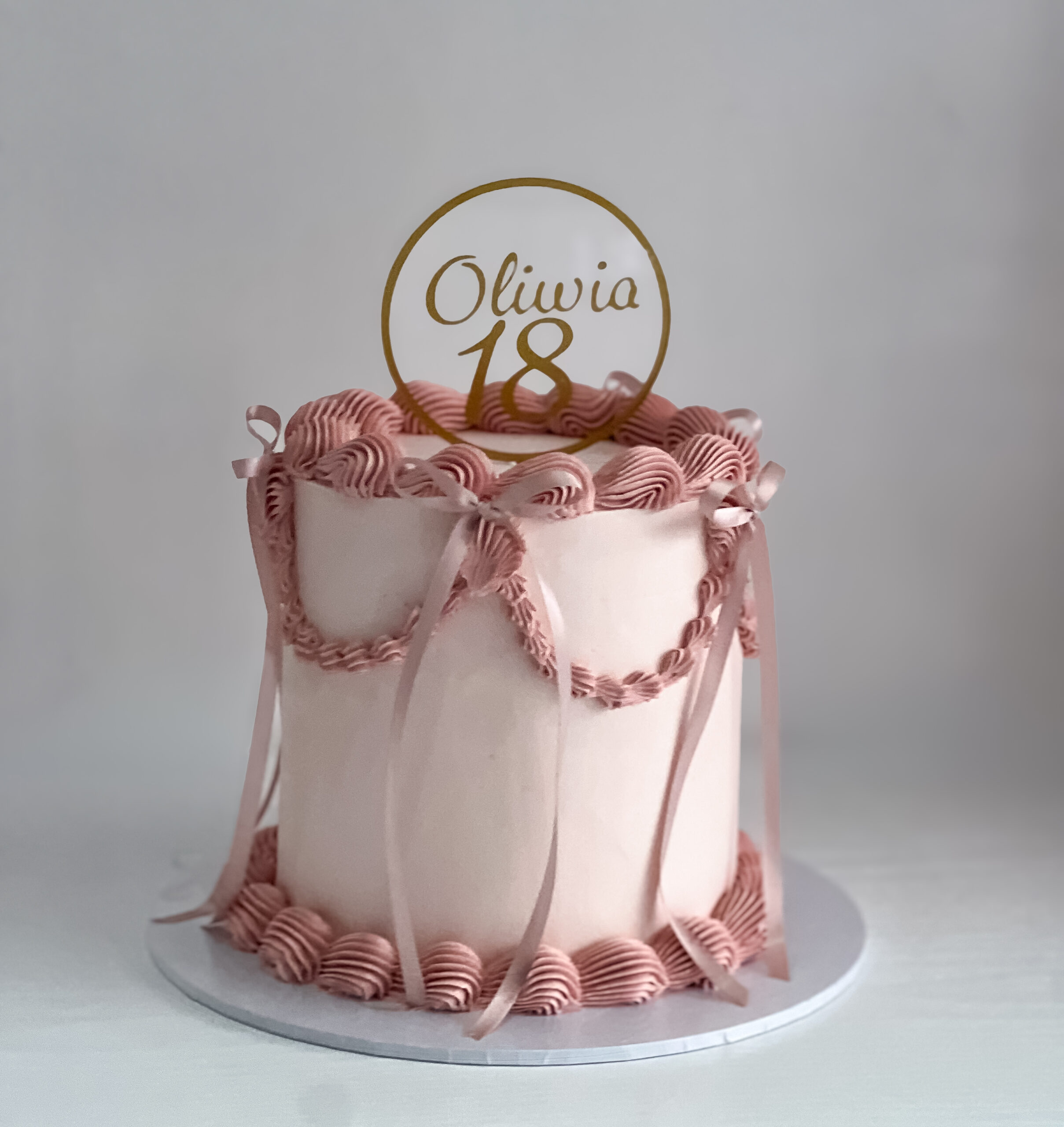 A beautifully detailed vintage-style celebration cake finished with intricate buttercream piping and elegant bow accents for a timeless, on-trend look.