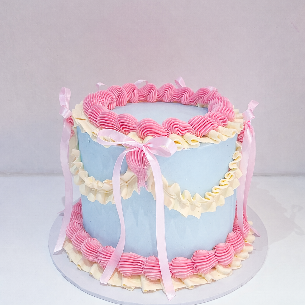Celebrate the big surprise with our Vintage Gender Reveal Cake! This beautifully piped buttercream cake features soft pink and blue detailing, creating a classic and elegant design. Cut inside to reveal a hidden colour—pink for a girl or blue for a boy—making your special moment even sweeter!